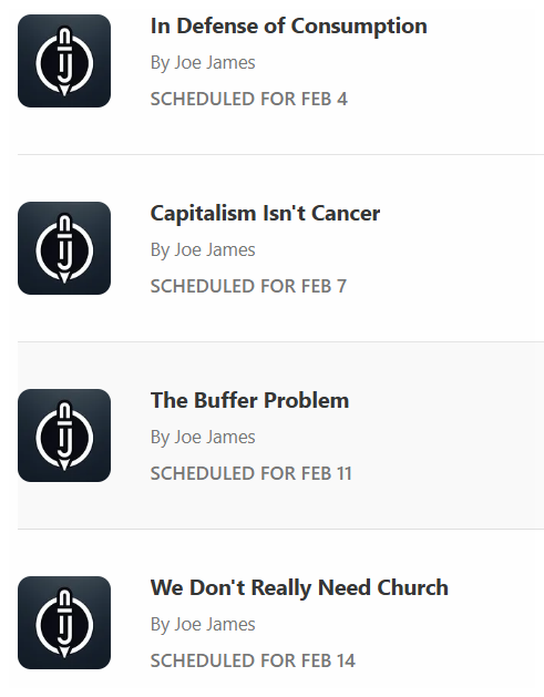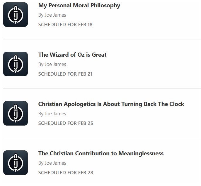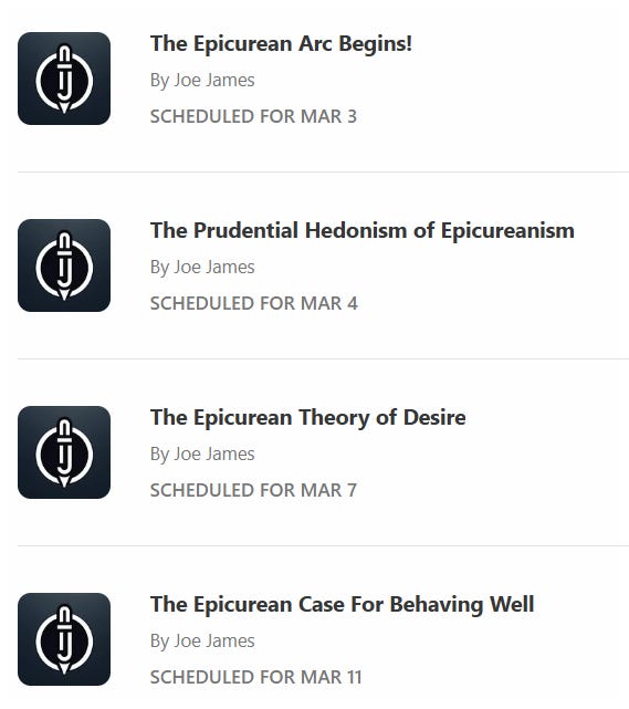 I’m really excited for the Epicurean Arc, which right now is scheduled to begin in March. I have one more planned post in that arc, but will probably start it today or next week. When I publish an arc, I’ll probably write a post that will go out the day before introducing it (on a Monday or Thursday).